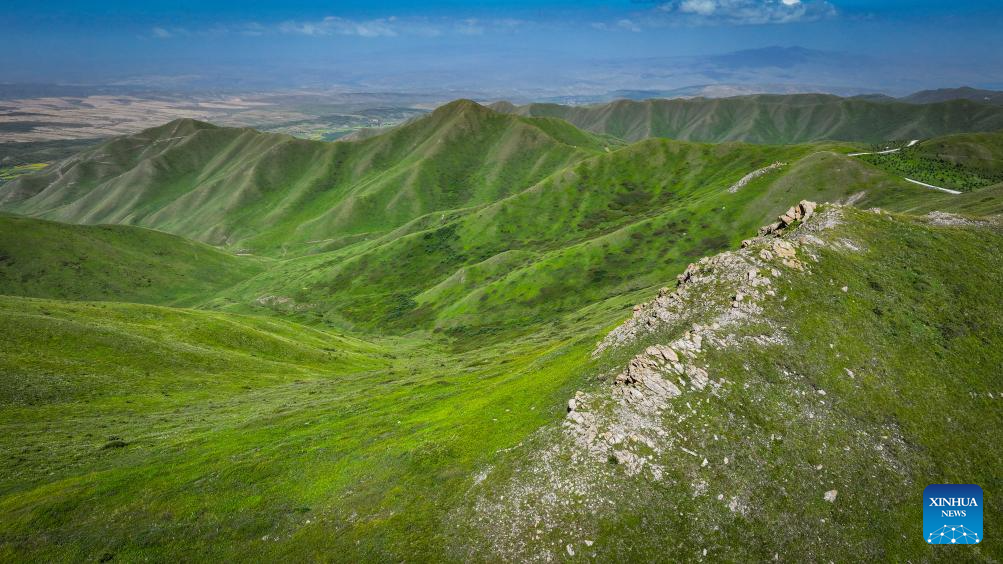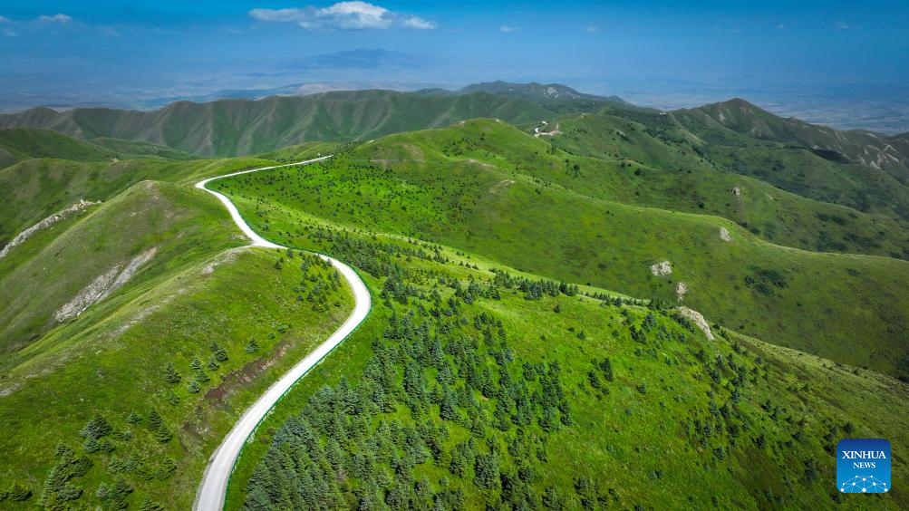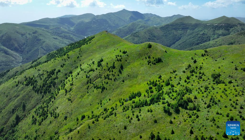 This photo taken on July 25, 2024 shows a view of the Nanhua Mountain in Haiyuan County of Zhongwei, northwest China's Ningxia Hui Autonomous Region. With years of ecological restoration efforts, Nanhua Mountain has a forest coverage rate of about 30.7 percent and the vegetation coverage of over 95 percent. (Xinhua/Feng Kaihua)