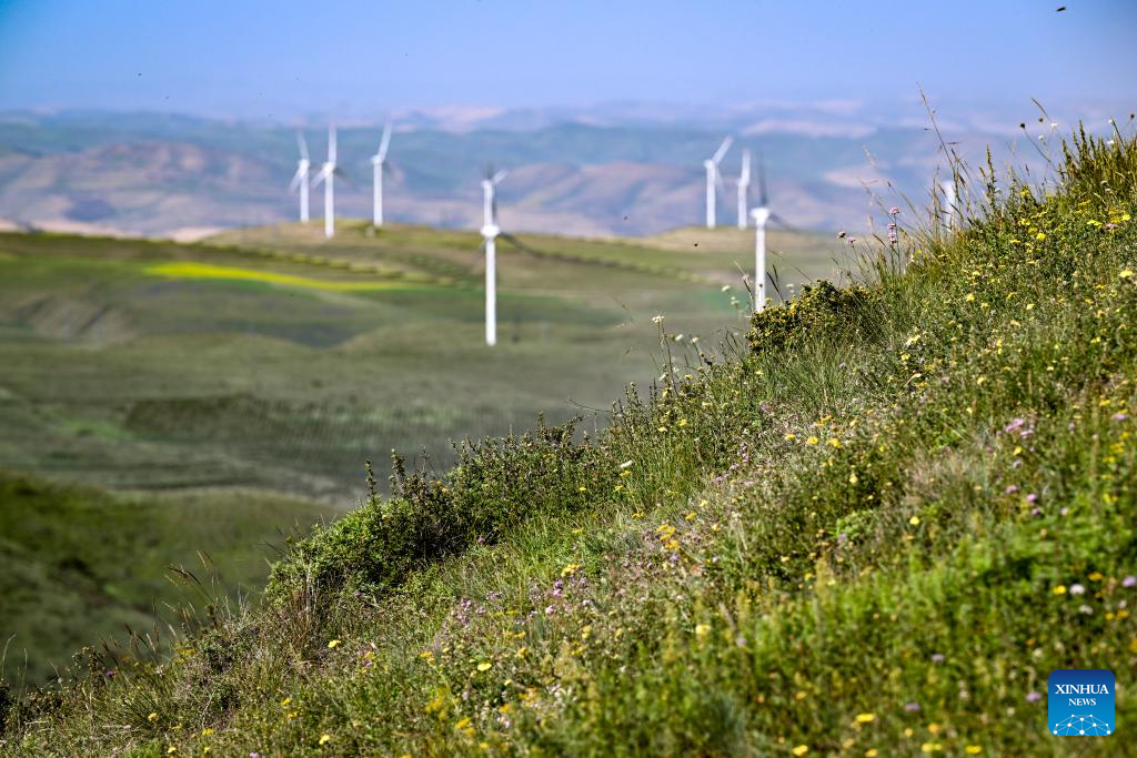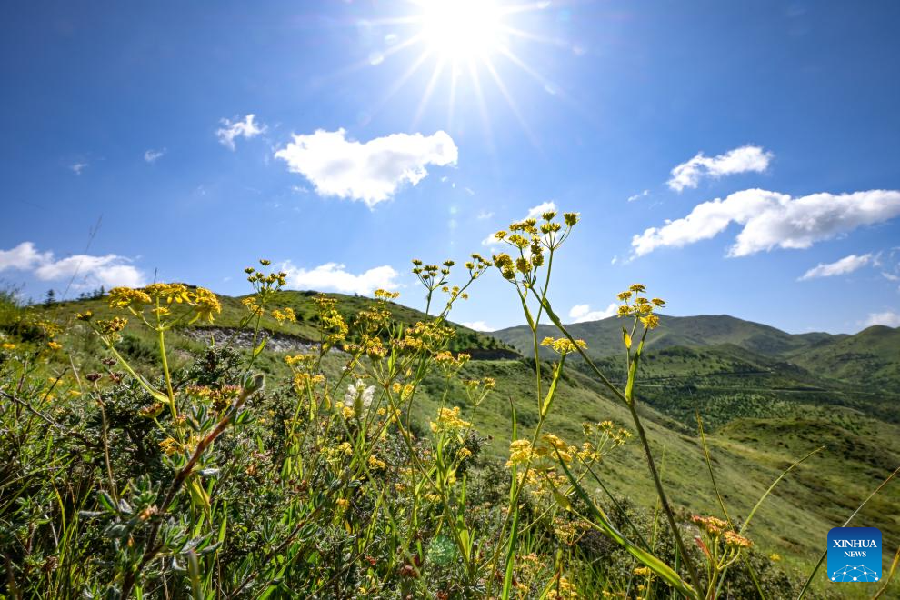This photo taken on July 25, 2024 shows blooming flowers on the Nanhua Mountain in Haiyuan County of Zhongwei, northwest China's Ningxia Hui Autonomous Region. With years of ecological restoration efforts, Nanhua Mountain has a forest coverage rate of about 30.7 percent and the vegetation coverage of over 95 percent. (Xinhua/Feng Kaihua)