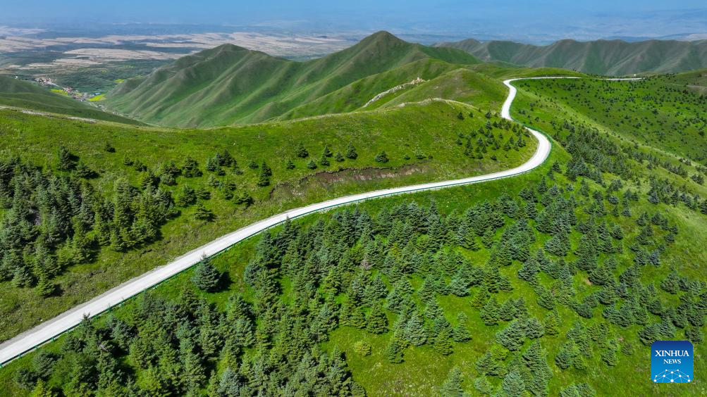 An aerial drone photo taken on July 25, 2024 shows a view of the Nanhua Mountain in Haiyuan County of Zhongwei, northwest China's Ningxia Hui Autonomous Region. With years of ecological restoration efforts, Nanhua Mountain has a forest coverage rate of about 30.7 percent and the vegetation coverage of over 95 percent. (Xinhua/Feng Kaihua)