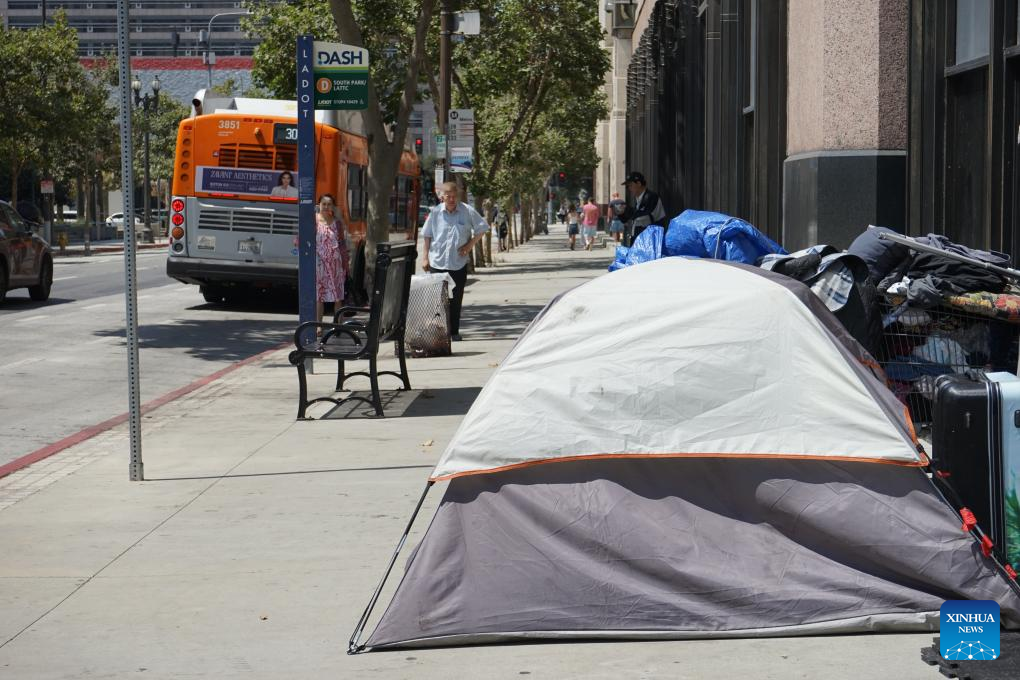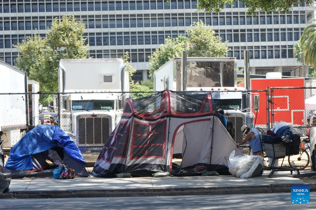 Tents of homeless people are seen in downtown Los Angeles, California, the United States, on July 25, 2024. California governor Gavin Newsom issued an executive order on Thursday directing officials in the most populated U.S. state to urgently address homeless encampments. (Photo by Zeng Hui/Xinhua)