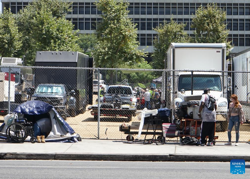 People are seen near a tent of homeless people in downtown Los Angeles, California, the United States, on July 25, 2024. California governor Gavin Newsom issued an executive order on Thursday directing officials in the most populated U.S. state to urgently address homeless encampments. (Photo by Zeng Hui/Xinhua)