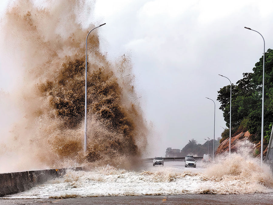 A giant wave crashes over a road in Xiapu county, Fujian province, on Thursday. Local authorities have stepped up preparations for flood control as Typhoon Gaemi, the third typhoon of this year, made landfall along the coast of the province on Thursday evening. (JIANG KEHONG/XINHUA)