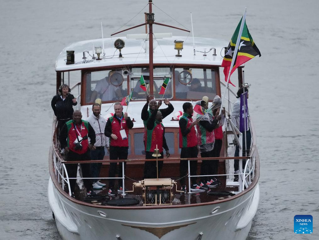 Members of the delegation of Saint Kitts and Nevis are seen during the opening ceremony of the Paris 2024 Olympic Games in Paris, France, July 26, 2024. (Xinhua/Wan Xiang)