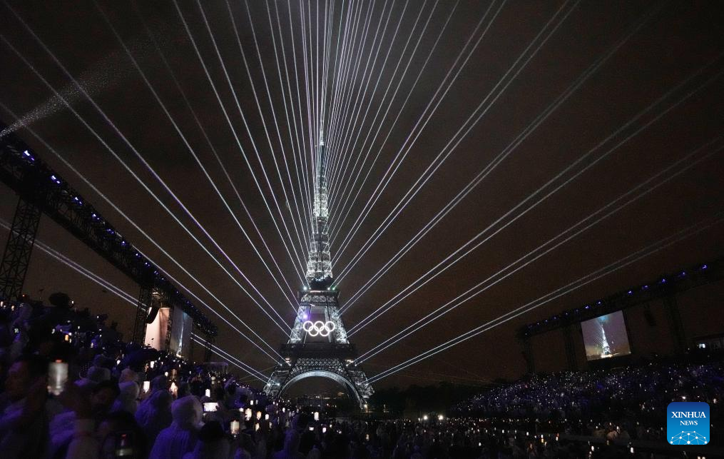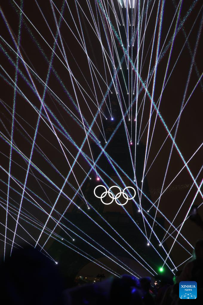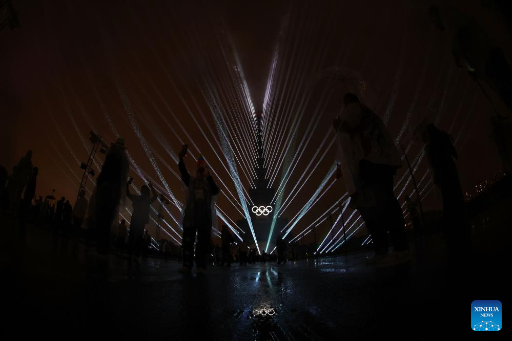 A light show is seen as the Olympic Rings on the Eiffel Tower are illuminated during the opening ceremony of the Paris 2024 Olympic Games in Paris, France, July 26, 2024. (Xinhua/Li Ming)