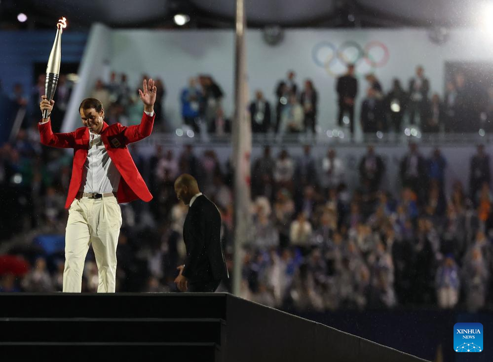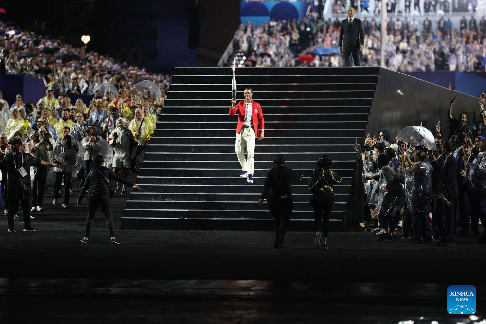 Spain's tennis player Rafael Nadal carries the Olympic flame during the opening ceremony of the Paris 2024 Olympic Games in Paris, France, July 26, 2024. (Xinhua/Li Ming)
