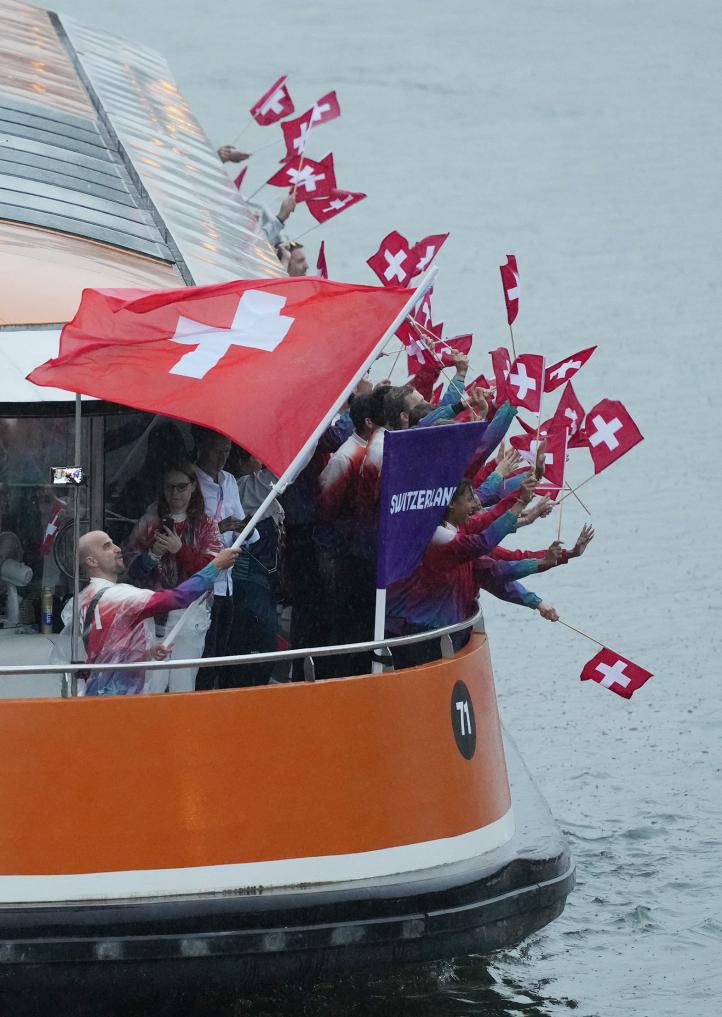 Members of the delegation of Switzerland are seen during the opening ceremony of the Paris 2024 Olympic Games in Paris, France, July 26, 2024. (Xinhua/Wan Xiang)