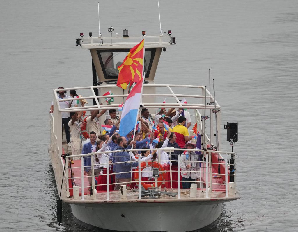Members of the delegations of Luxembourg and Macedonia are seen during the opening ceremony of the Paris 2024 Olympic Games in Paris, France, July 26, 2024. (Xinhua/Wan Xiang)