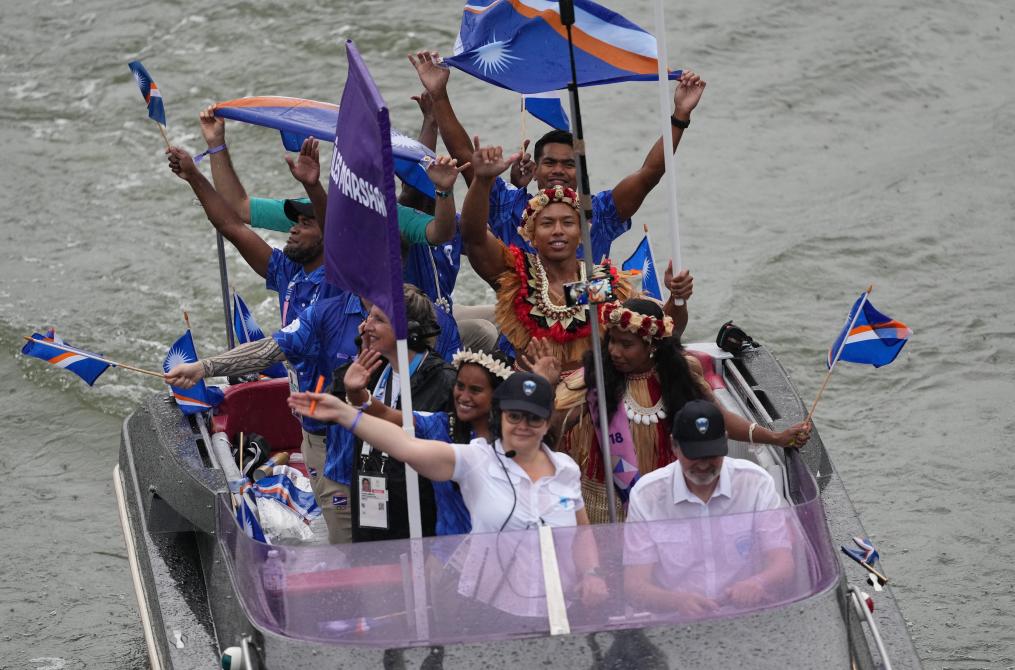 Members of the delegation of Marshall Islands are seen during the opening ceremony of the Paris 2024 Olympic Games in Paris, France, July 26, 2024. (Xinhua/Wan Xiang)