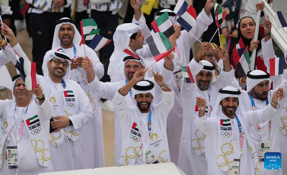 Members of the delegation of the United Arab Emirates are seen during the opening ceremony of the Paris 2024 Olympic Games in Paris, France, July 26, 2024. (Xinhua/Wan Xiang)