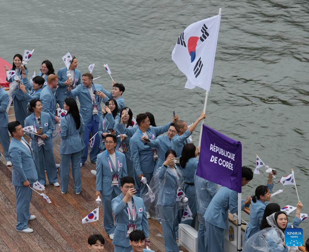Members of the delegation of the Republic of Korea are seen during the opening ceremony of the Paris 2024 Olympic Games in Paris, France, July 26, 2024. (Xinhua/Wan Xiang)