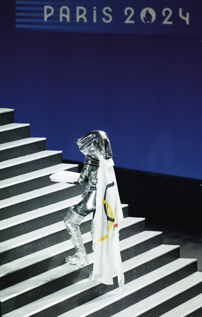Floriane Issert, a Gendarmerie non-commissioned officer of the National Gendarmerie, carries the Olympic flag during the opening ceremony of the Paris 2024 Olympic Games in Paris, France, July 26, 2024. (Xinhua/Shen Bohan)