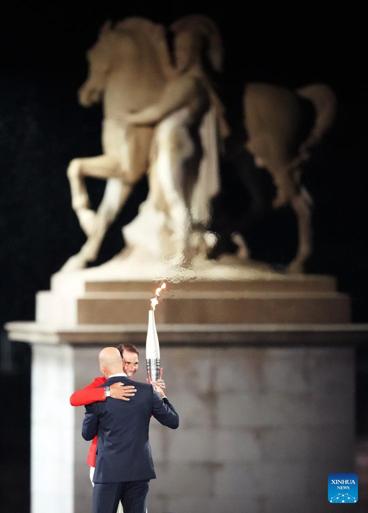 Former French football player Zinedine Zidane hands the Olympic flame to Spain's tennis player Rafael Nadal at the Trocadero during the opening ceremony of the Paris 2024 Olympic Games in Paris, France, July 26, 2024. (Xinhua/Li Ming)