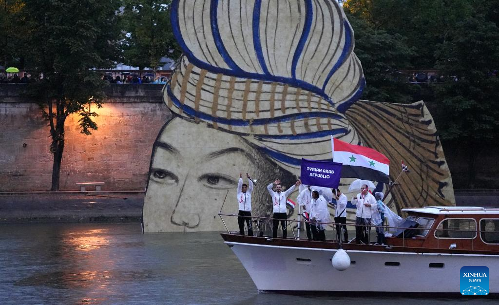 Members of the Syrian delegation attend the opening ceremony of the Paris 2024 Olympic Games in Paris, France, July 26, 2024. (Xinhua/Jiang Wenyao)
