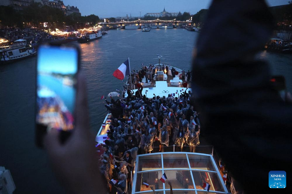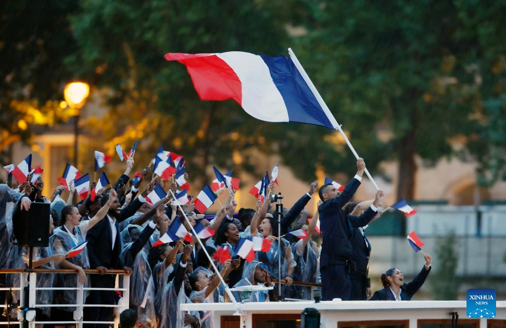 Members of the delegation of France are seen during the opening ceremony of the Paris 2024 Olympic Games in Paris, France, July 26, 2024. (Xinhua/Li Ming)