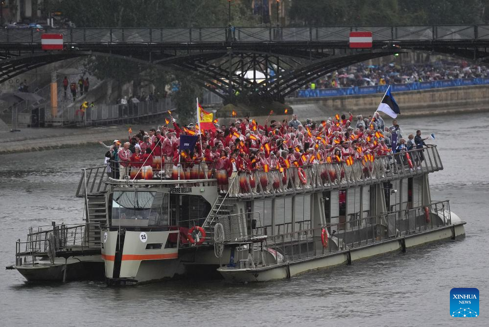 Members of the Spanish and Estonian delegations are seen during the opening ceremony of the Paris 2024 Olympic Games in Paris, France, July 26, 2024. (Xinhua/Meng Yongmin)