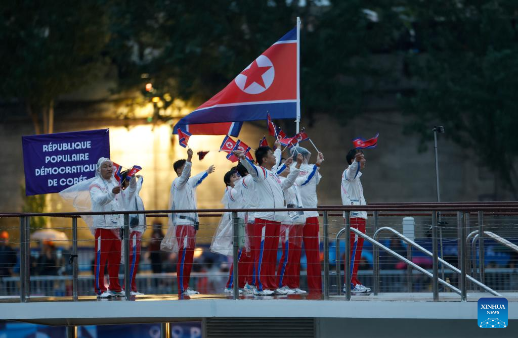 Members of the delegation of the Democratic People's Republic of Korea (DPRK) are seen during the opening ceremony of the Paris 2024 Olympic Games in Paris, France, July 26, 2024. (Xinhua/Fei Maohua)