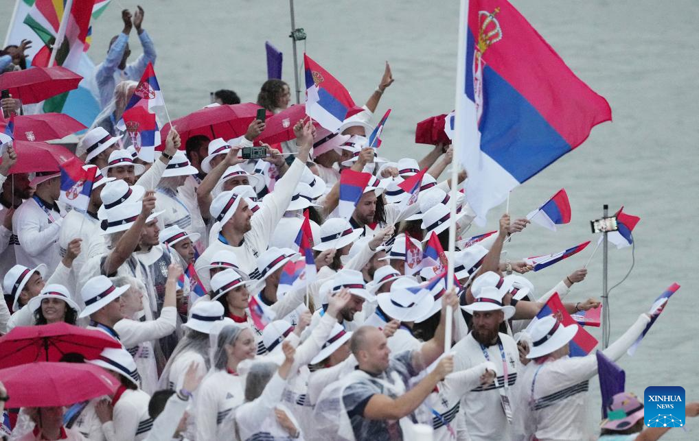 Members of the delegation of Serbia are seen during the opening ceremony of the Paris 2024 Olympic Games in Paris, France, July 26, 2024. (Xinhua/Wan Xiang)