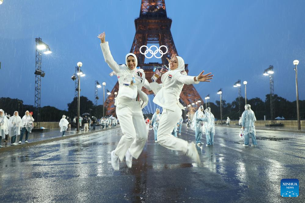 Members of the delegation of Egypt are seen during the opening ceremony of the Paris 2024 Olympic Games in Paris, France, July 26, 2024, as the Eiffel Tower is seen in the background. (Xinhua/Li Ming)