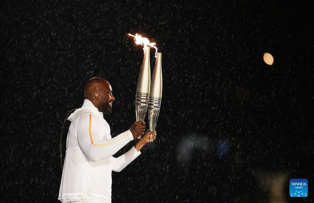 Torchbearers Teddy Riner and Marie-Jose Perec hold the Olympic torches during the opening ceremony of the Paris 2024 Olympic Games in Paris, France, July 26, 2024. (Xinhua/Du Yu)