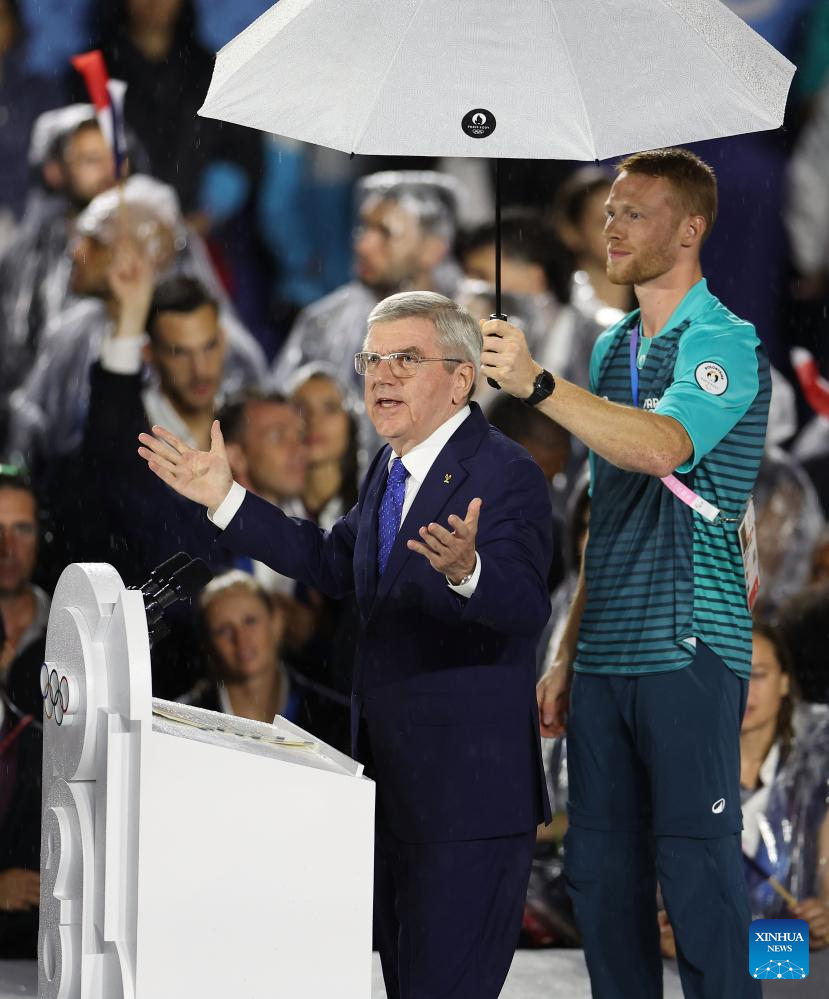 International Olympic Committee (IOC) President Thomas Bach speaks during the opening ceremony of the Paris 2024 Olympic Games in Paris, France, July 26, 2024. (Xinhua/Li Ying)