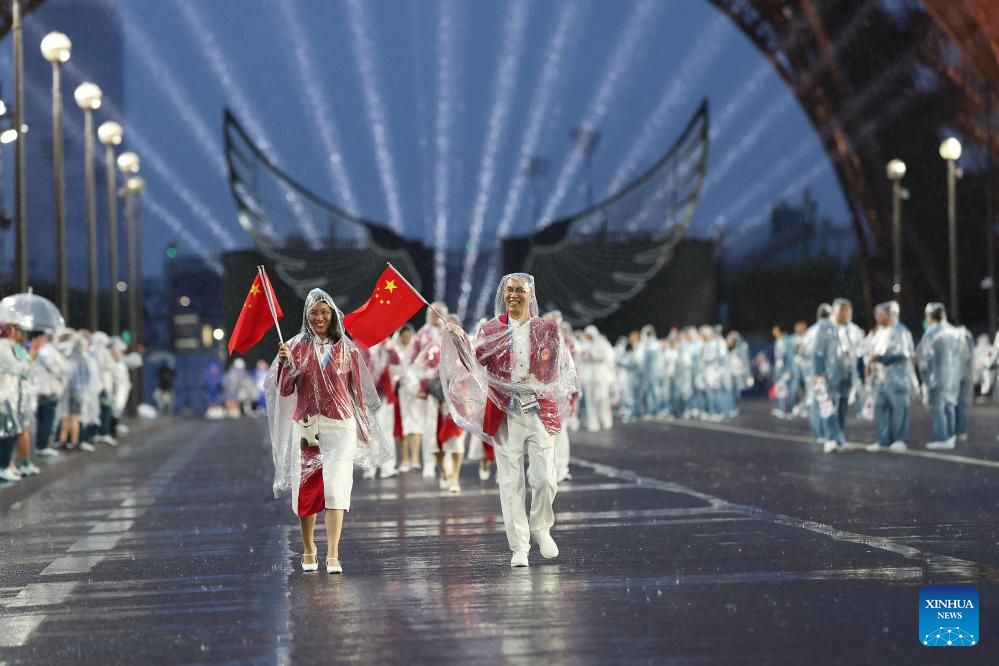 Members of the Chinese delegation attend the opening ceremony of the Paris 2024 Olympic Games in Paris, France, July 26, 2024. (Xinhua/Gao Jing)