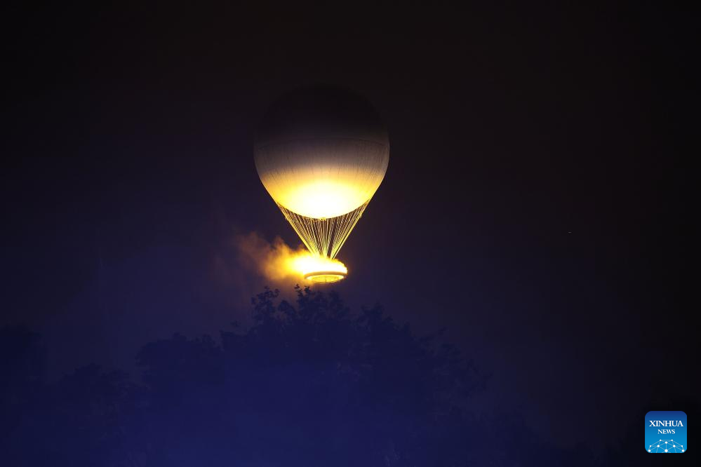 A balloon carrying the lit Olympic cauldron lifts off during the opening ceremony of the Paris 2024 Olympic Games in Paris, France, July 26, 2024. (Xinhua/Li Gang)