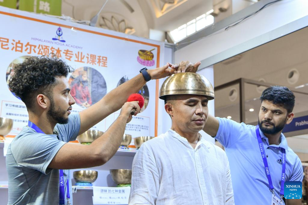 A visitor (C) experiences a Nepalese singing bowl, a kind of tool for sound therapy, at the South Asia Pavilion during the 8th China-South Asia Expo in Kunming, southwest China's Yunnan Province, July 26, 2024. The 8th China-South Asia Expo runs from July 23 to 28 in Kunming. The expo presents 15 pavilions, including two dedicated to South Asian countries, showcasing a total of approximately 800 booths. (Xinhua/Peng Yikai)
