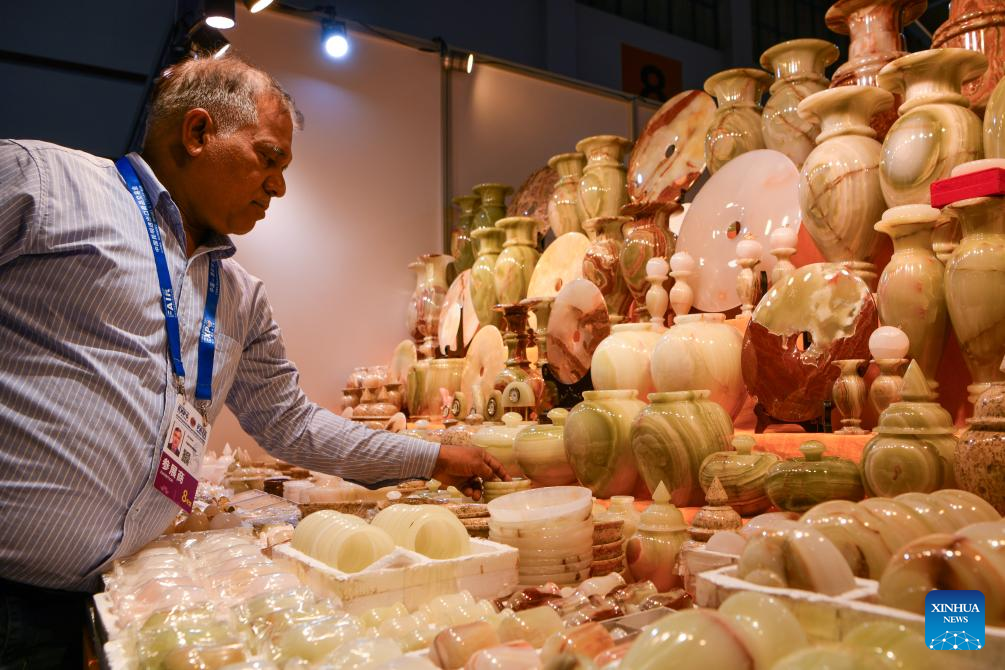 A Pakistani exhibitor arranges exhibits at the South Asia Pavilion during the 8th China-South Asia Expo in Kunming, southwest China's Yunnan Province, July 26, 2024. The 8th China-South Asia Expo runs from July 23 to 28 in Kunming. The expo presents 15 pavilions, including two dedicated to South Asian countries, showcasing a total of approximately 800 booths. (Xinhua/Peng Yikai)