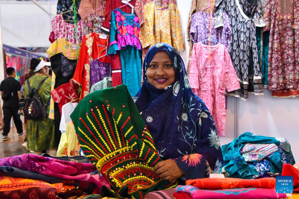 A Bangladeshi exhibitor displays Bangladeshi costumes at the South Asia Pavilion during the 8th China-South Asia Expo in Kunming, southwest China's Yunnan Province, July 26, 2024. The 8th China-South Asia Expo runs from July 23 to 28 in Kunming. The expo presents 15 pavilions, including two dedicated to South Asian countries, showcasing a total of approximately 800 booths. (Xinhua/Peng Yikai)