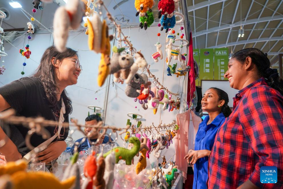 Visitors learn about handmade wool felt at the Nepal exhibition area of the South Asia Pavilion during the 8th China-South Asia Expo in Kunming, southwest China's Yunnan Province, July 26, 2024. The 8th China-South Asia Expo runs from July 23 to 28 in Kunming. The expo presents 15 pavilions, including two dedicated to South Asian countries, showcasing a total of approximately 800 booths. (Xinhua/Wang Jingyi)