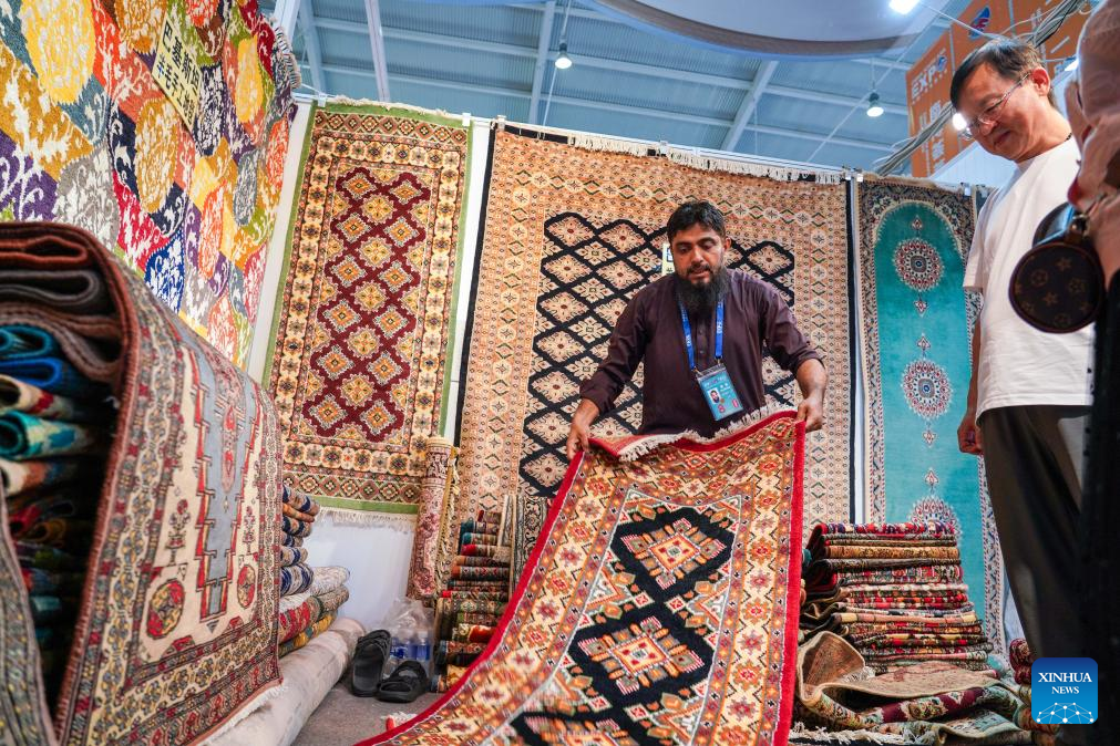 A Pakistani exhibitor (L) introduces carpets to visitors at the South Asia Pavilion during the 8th China-South Asia Expo in Kunming, southwest China's Yunnan Province, July 26, 2024. The 8th China-South Asia Expo runs from July 23 to 28 in Kunming. The expo presents 15 pavilions, including two dedicated to South Asian countries, showcasing a total of approximately 800 booths. (Xinhua/Wang Jingyi)
