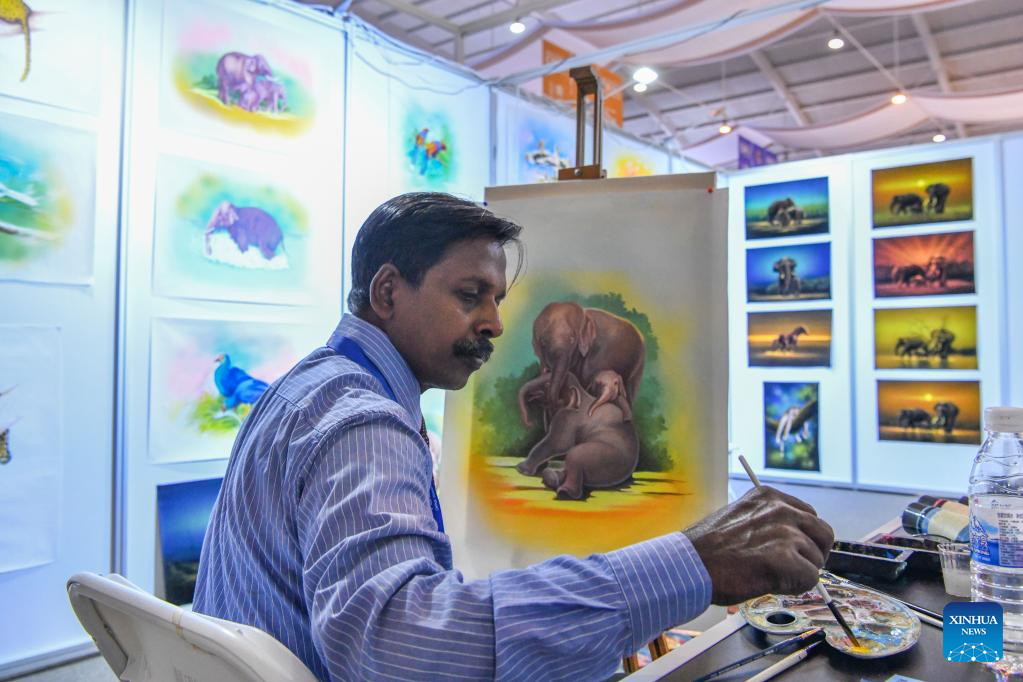 A Sri Lankan exhibitor paints at the South Asia Pavilion during the 8th China-South Asia Expo in Kunming, southwest China's Yunnan Province, July 26, 2024. The 8th China-South Asia Expo runs from July 23 to 28 in Kunming. The expo presents 15 pavilions, including two dedicated to South Asian countries, showcasing a total of approximately 800 booths. (Xinhua/Peng Yikai)