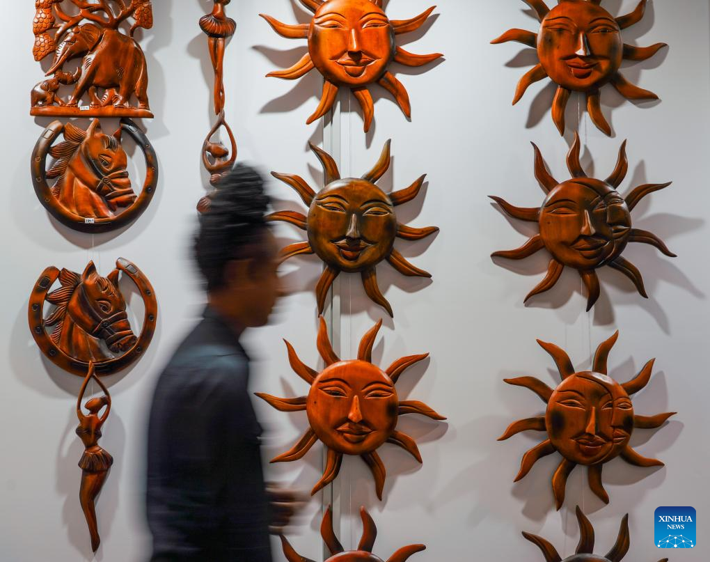 A Sri Lankan exhibitor walks past his booth at the South Asia Pavilion during the 8th China-South Asia Expo in Kunming, southwest China's Yunnan Province, July 26, 2024. The 8th China-South Asia Expo runs from July 23 to 28 in Kunming. The expo presents 15 pavilions, including two dedicated to South Asian countries, showcasing a total of approximately 800 booths. (Xinhua/Wang Jingyi)