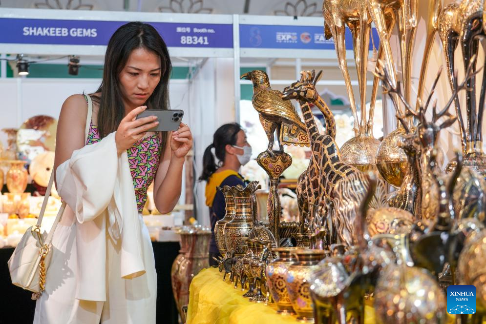 A visitor takes photos of products from Pakistan at the South Asia Pavilion during the 8th China-South Asia Expo in Kunming, southwest China's Yunnan Province, July 26, 2024. The 8th China-South Asia Expo runs from July 23 to 28 in Kunming. The expo presents 15 pavilions, including two dedicated to South Asian countries, showcasing a total of approximately 800 booths. (Xinhua/Wang Jingyi)