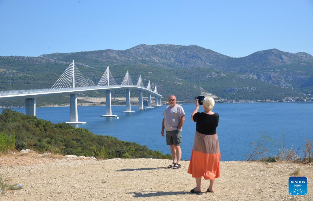 People take souvenir photos in front of the Peljesac Bridge in Komarna, Croatia, on July 26, 2024. Since its inauguration in July 2022, the Chinese-built Peljesac Bridge in Croatia has significantly boosted local businesses, creating new economic opportunities and facilitating smoother transportation on the Adriatic coast.