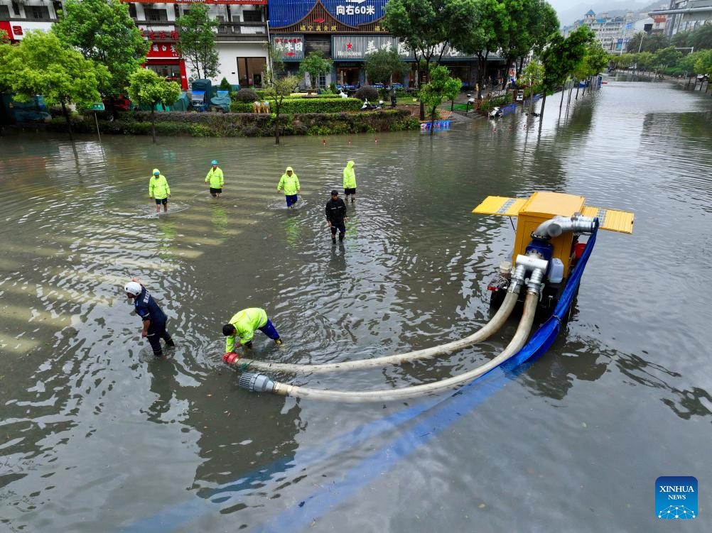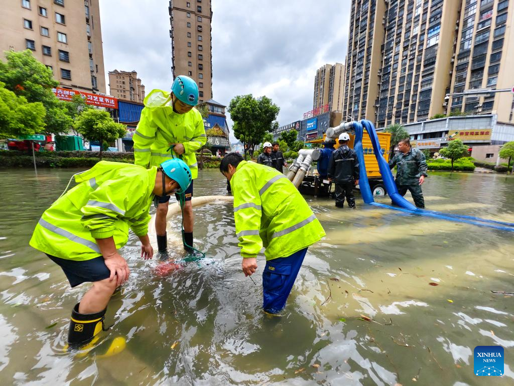 Rescuers carry out drainage operations in the flooded areas of Xiapu County in Ningde, southeast China's Fujian Province, July 26, 2024. As of 6 a.m. Friday, about 628,600 people in east China's Fujian Province had been affected by Typhoon Gaemi, the third typhoon of this year, with some 290,000 residents relocated so far, said local authorities. Rescue and relief work and post-disaster reconstruction are underway. (Xinhua/Jiang Kehong)