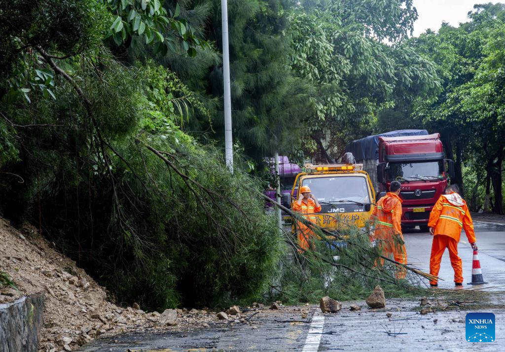 Staff members repair a road affected by fallen trees and landslides in Changle District of Fuzhou, southeast China's Fujian Province, July 26, 2024. As of 6 a.m. Friday, about 628,600 people in east China's Fujian Province had been affected by Typhoon Gaemi, the third typhoon of this year, with some 290,000 residents relocated so far, said local authorities. Rescue and relief work and post-disaster reconstruction are underway. (Xinhua/Wei Peiquan)
