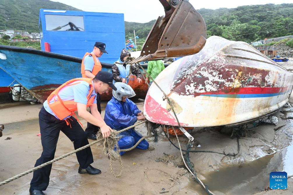 Village cadres and police officers help a villager arrange a ship overturned by the typhoon in Pingtan, southeast China's Fujian Province, July 26, 2024. As of 6 a.m. Friday, about 628,600 people in east China's Fujian Province had been affected by Typhoon Gaemi, the third typhoon of this year, with some 290,000 residents relocated so far, said local authorities. Rescue and relief work and post-disaster reconstruction are underway. (Xinhua/Lin Shanchuan)