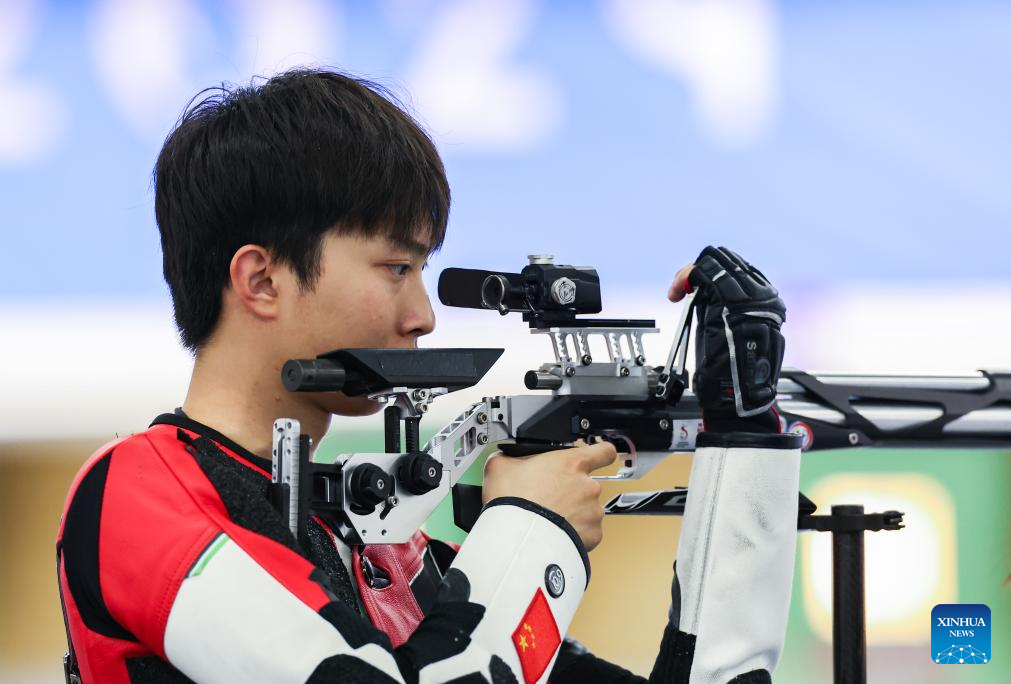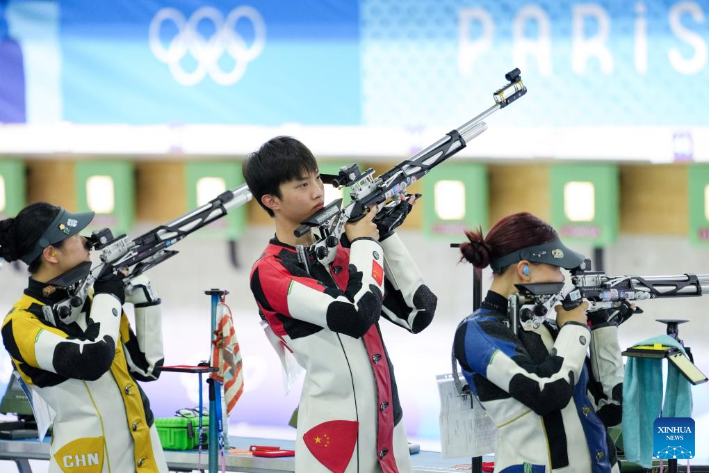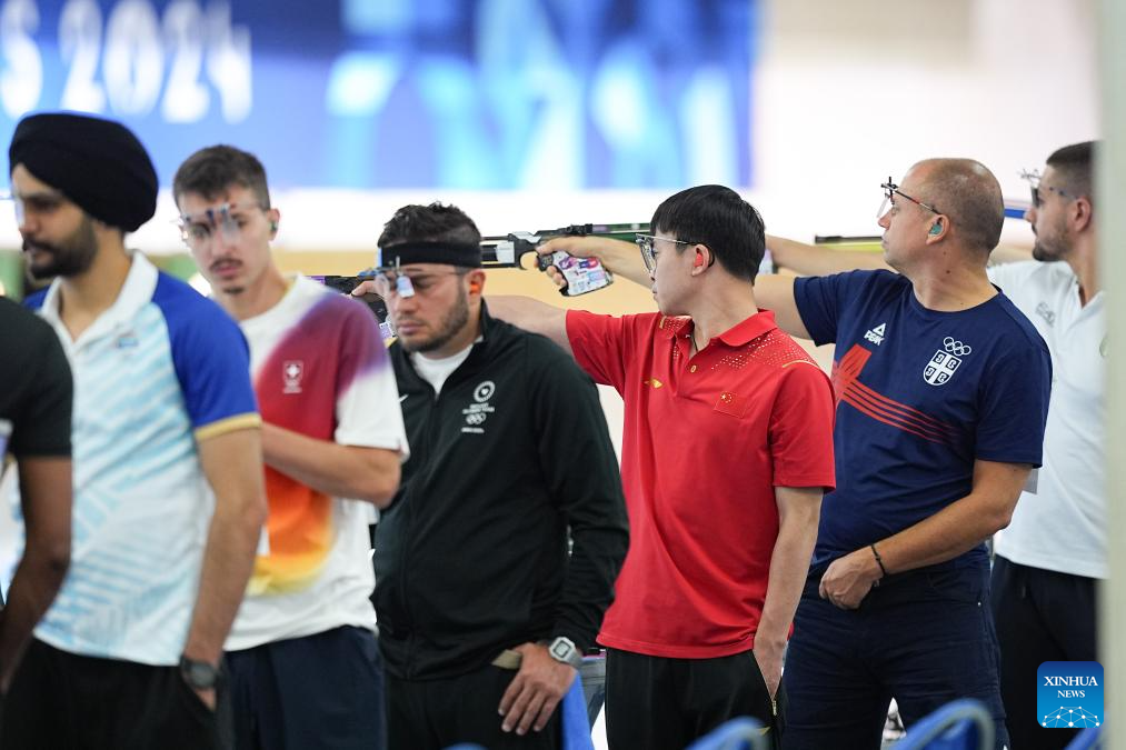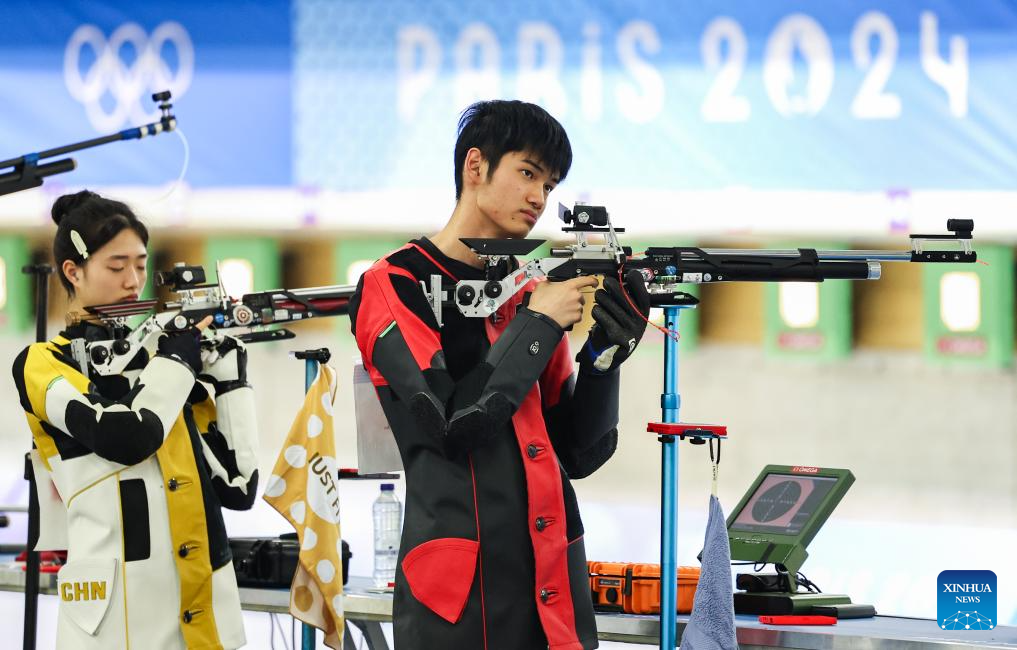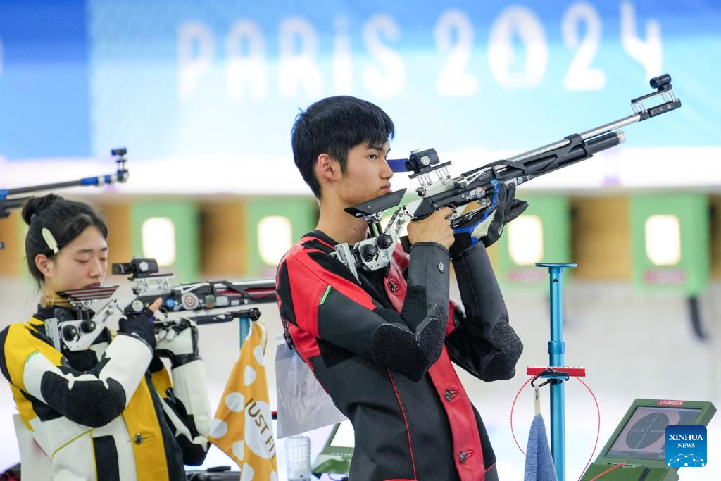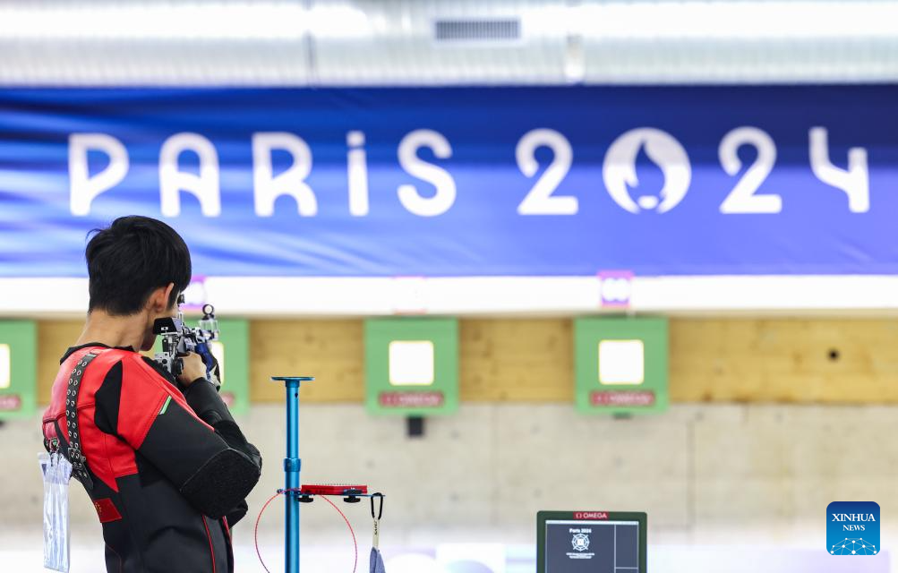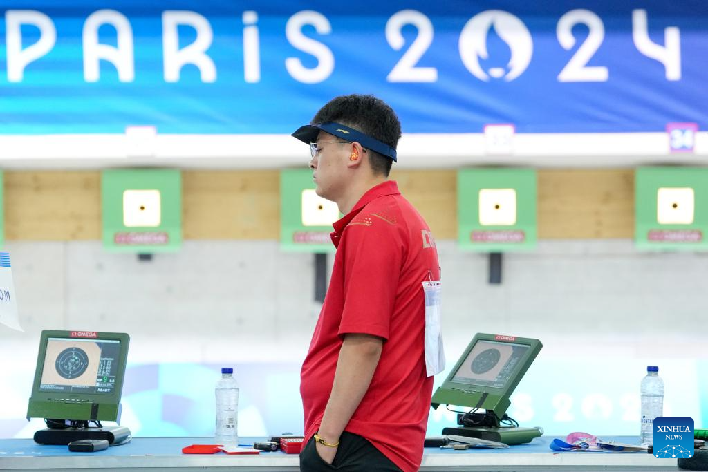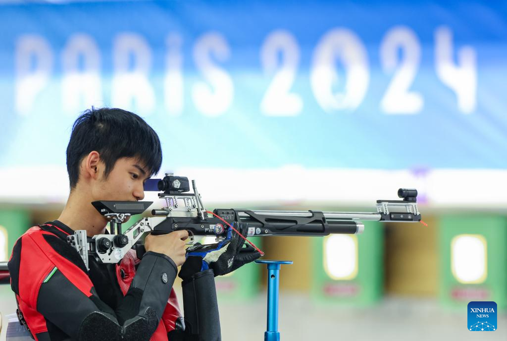 Sheng Lihao of China attends a shooting training session ahead of the Paris 2024 Olympic Games in Chateauroux, France, on July 26, 2024. (Xinhua/Zhang Fan)