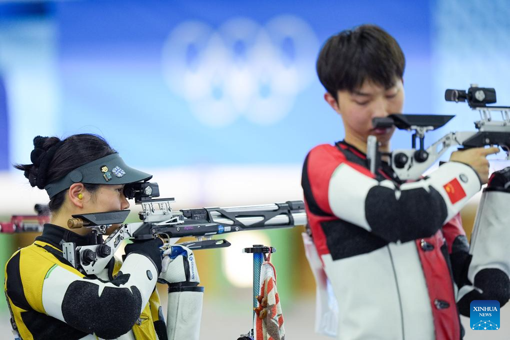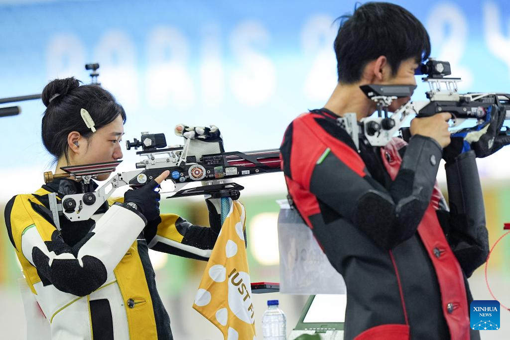 Huang Yuting (L) and Sheng Lihao of China attend a shooting training session ahead of the Paris 2024 Olympic Games in Chateauroux, France, on July 26, 2024. (Xinhua/Zhang Fan)