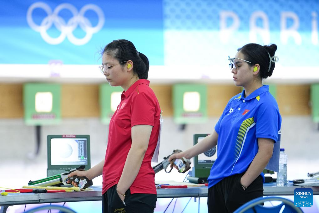 Jiang Ranxin (L) of China attends a shooting training session ahead of the Paris 2024 Olympic Games in Chateauroux, France, on July 26, 2024. (Xinhua/Ju Huanzong)