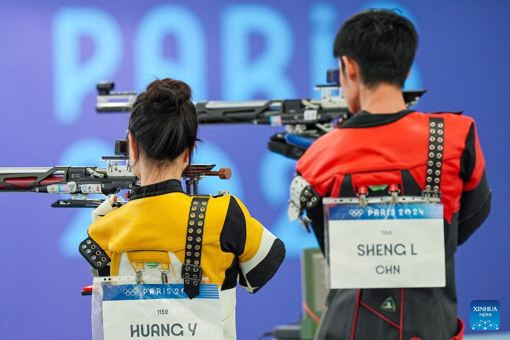 Huang Yuting (L) and Sheng Lihao of China attend a shooting training session ahead of the Paris 2024 Olympic Games in Chateauroux, France, on July 26, 2024. (Xinhua/Ju Huanzong)