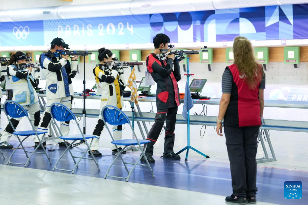 Xie Yu (3rd R) of China attends a shooting training session ahead of the Paris 2024 Olympic Games in Chateauroux, France, on July 26, 2024. (Xinhua/Ju Huanzong)