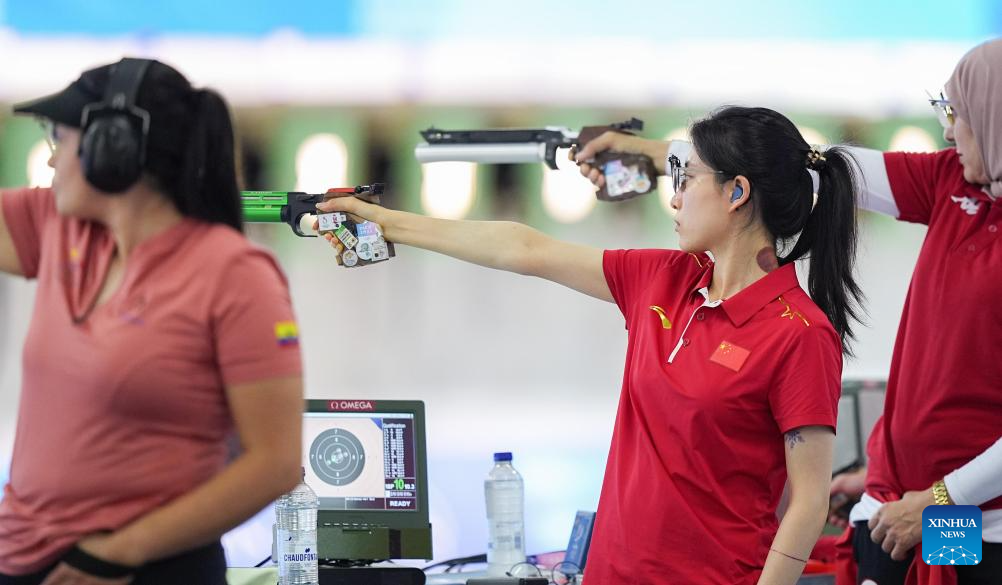 Li Xue (2nd L) of China attends a shooting training session ahead of the Paris 2024 Olympic Games in Chateauroux, France, on July 26, 2024. (Xinhua/Ju Huanzong)
