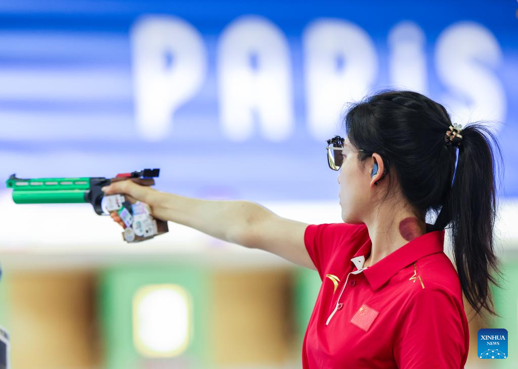 Li Xue of China attends a shooting training session ahead of the Paris 2024 Olympic Games in Chateauroux, France, on July 26, 2024. (Xinhua/Zhang Fan)