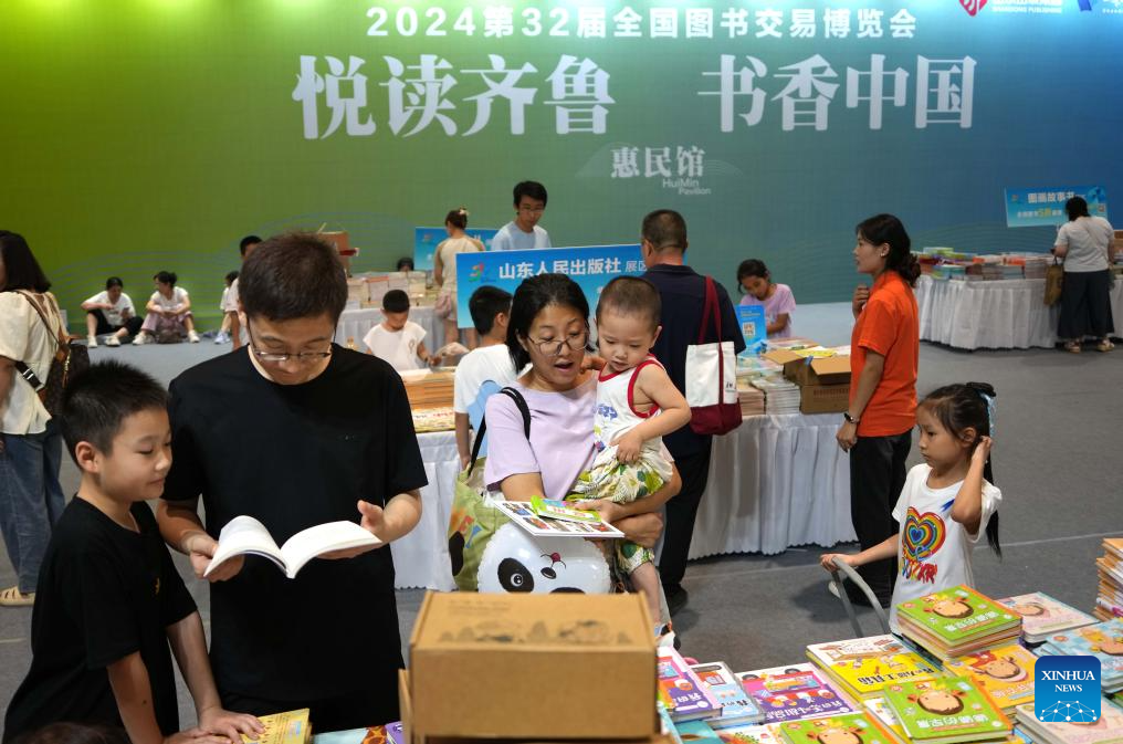 Readers view books during the 32nd National Book Expo in Jinan, capital of east China's Shandong Province, July 26, 2024. Over 700,000 publications of various types have been put on display, both online and on site, at the 32nd National Book Expo in Jinan, capital of east China's Shandong Province.