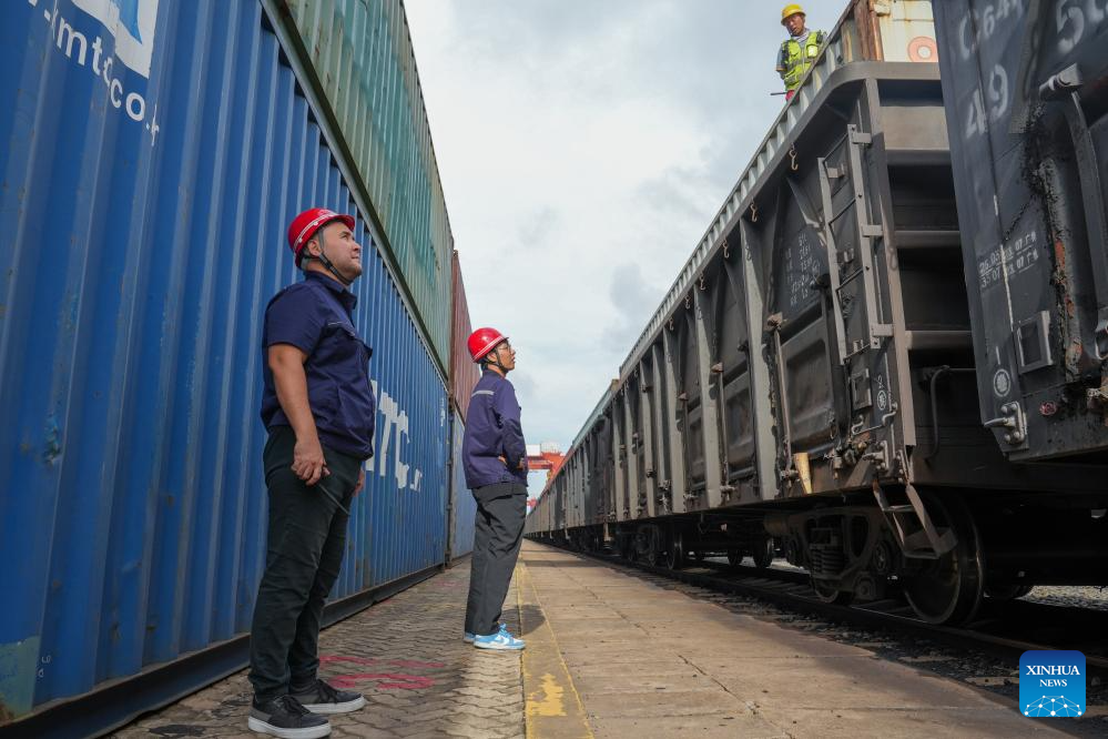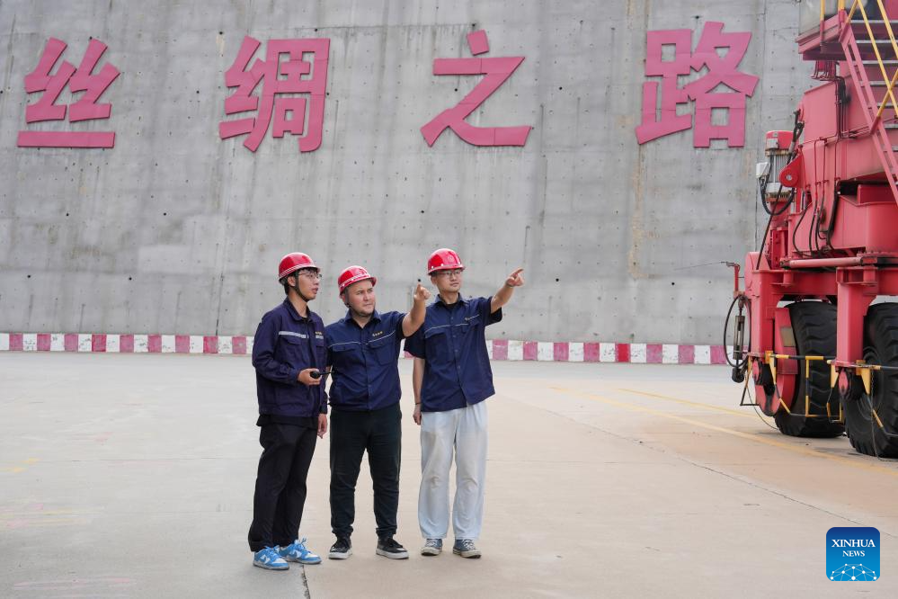 Bedelov Azilkhan (rear) and his colleague work at the China-Kazakhstan (Lianyungang) Logistics Cooperation Base in Lianyungang, east China's Jiangsu Province, July 25, 2024. (Xinhua/Li Bo)