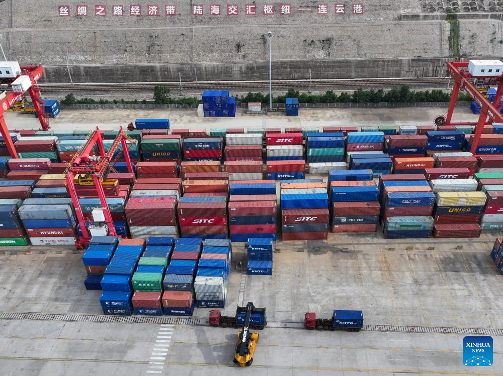 An aerial drone photo shows a container yard at the China-Kazakhstan (Lianyungang) Logistics Cooperation Base in Lianyungang, east China's Jiangsu Province, July 25, 2024. (Xinhua/Li Bo)