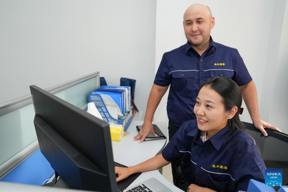 Bedelov Azilkhan (C) and his colleagues work at the China-Kazakhstan (Lianyungang) Logistics Cooperation Base in Lianyungang, east China's Jiangsu Province, July 25, 2024. (Xinhua/Li Bo)