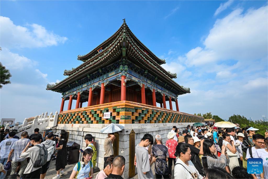 People visit the Wanchun pavilion on the mountain top of the Jingshan park in Beijing, capital of China, July 16, 2024. (Xinhua/Chen Yehua)